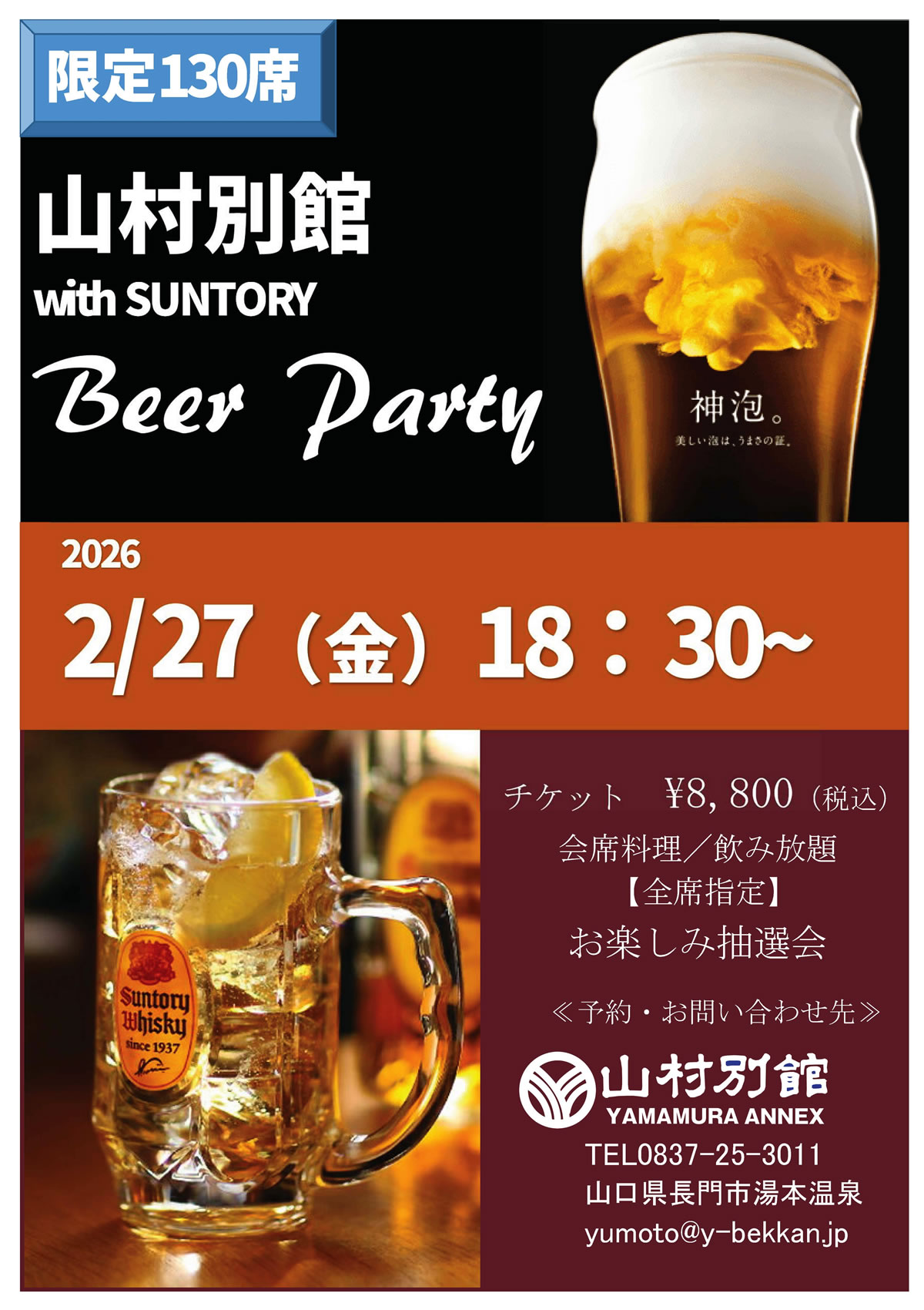 2月27日(金)18時30分より、恒例の 山村別館 with SUNTORY Beer Partyを開催いたします。